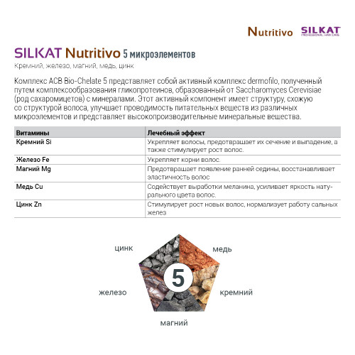 Минерализацию волос осуществляют активный комплекс ACB Bio-Chelate 5 в который входят минералы: железо, кремний, магний, медь, цинк